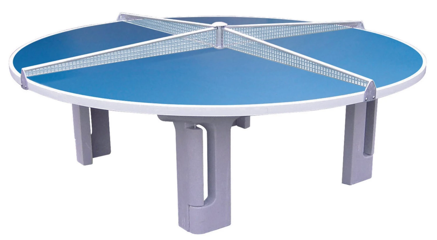 An interesting new style of playing table tennis table. This table allows 2 games of singles or doubles to take place at the same time. Unique round shape with a 25mm reinforced playing top together with a net and post set which covers the centre of the table in 2 directions.
