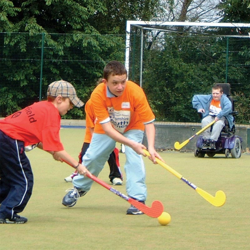 The equipment bridges the gap to the real game. The sticks have a large head to increase the hitting surface and are lightweight for ease of handling.