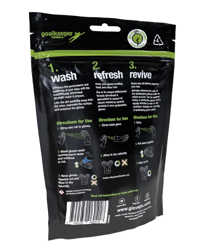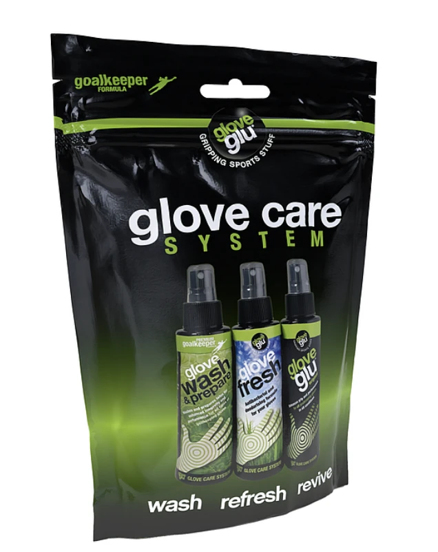 GloveGlu Goalkeeping Glove Care System Triple Pack comes with Wash Refresh and Revive to enhance the performance and longevity of your latex and Keeps your gloves smelling fresh and odour free.